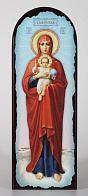 Божия Матерь запечатлена стоящей на золотистом облаке в полный рост, из-под облачения тёмно-синего цвета видны босые стопы. Она держит сына, в левой руке которого увенчанная крестом держава. Высоко поднятой правой рукой Младенец Христос благословляет верующих.