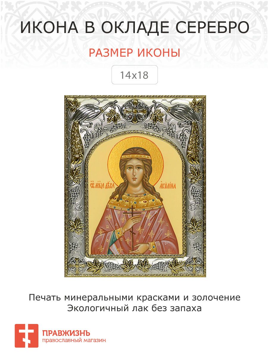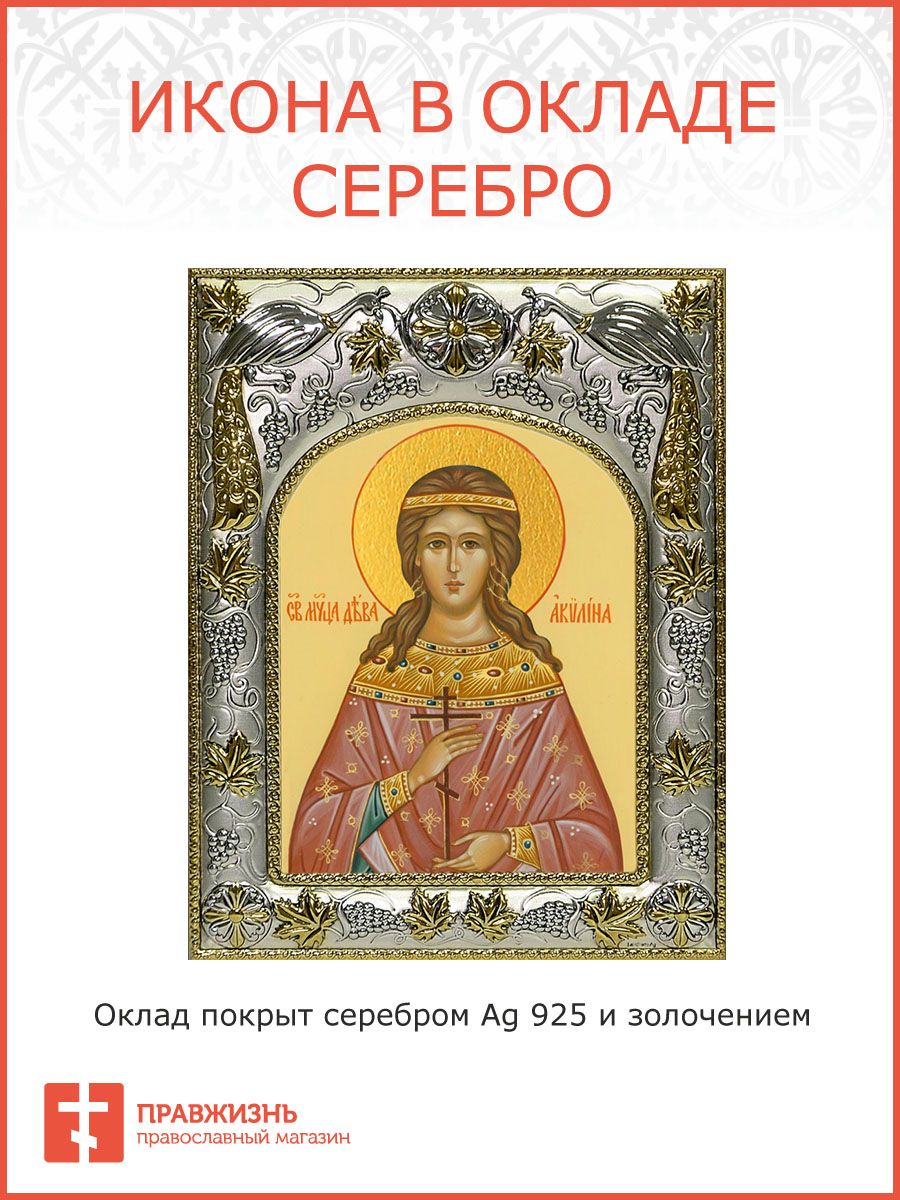 Иконография Акилины представляет её юной девушкой, облаченной в традиционные одежды, часто с крестом в руке, символизирующим её мученический подвиг. Взгляд её исполнен кротости и смирения, но в то же время отражает непоколебимую веру. Икона Акилины является символом стойкости в вере, чистоты и преданности Христу.