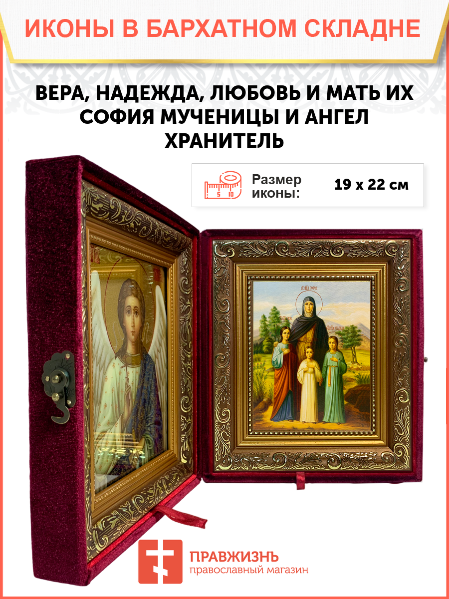 Именная икона Вера Надежда Любовь и София Римские с деревьями на холсте в киоте 044