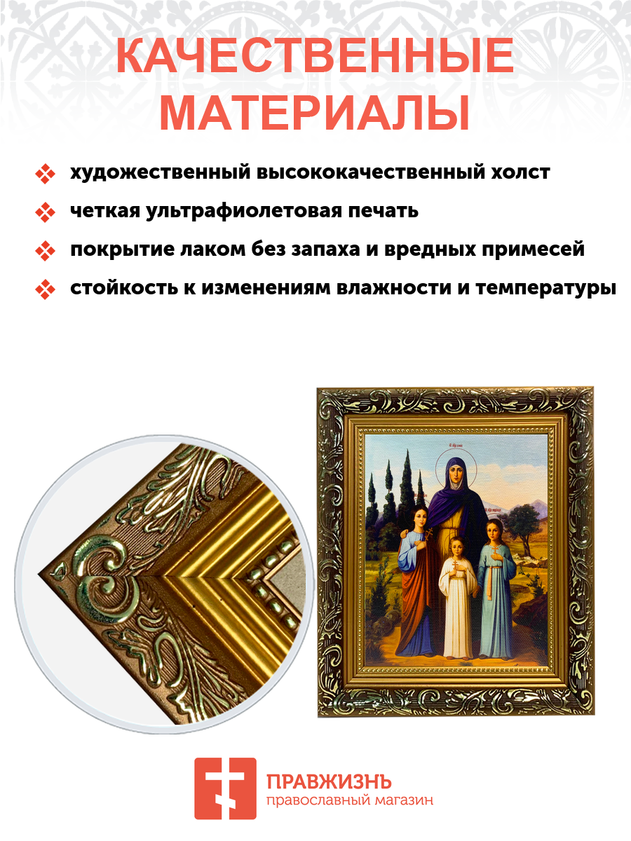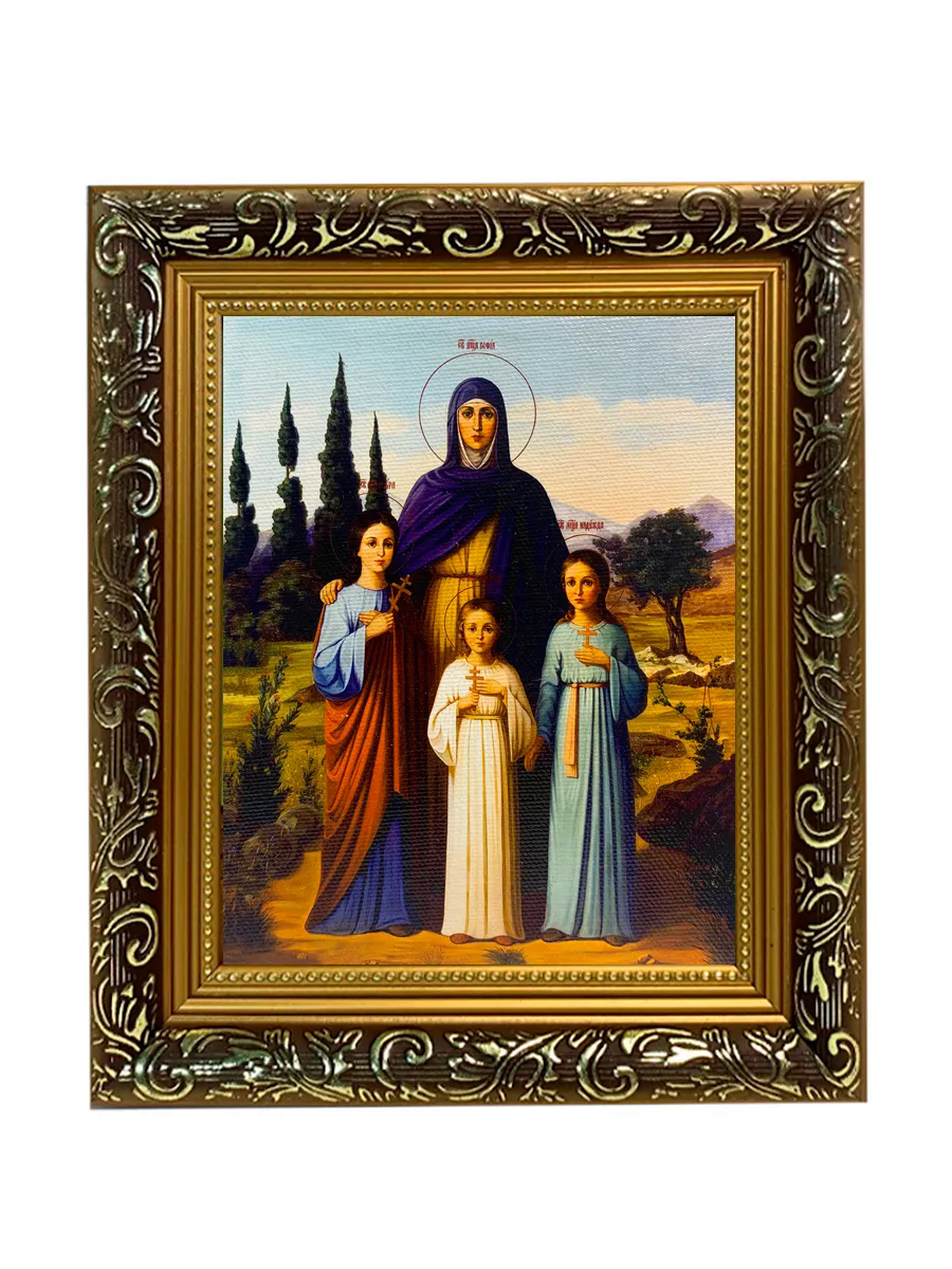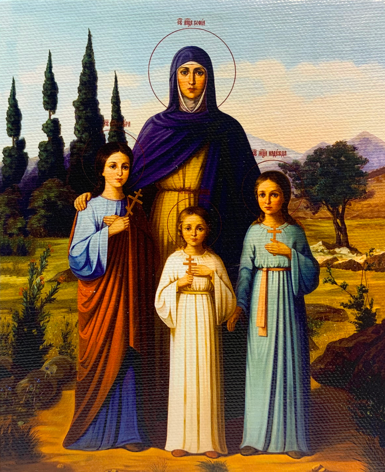 Именная икона Вера Надежда Любовь и София Римские с кипарисами на холсте в киоте 044