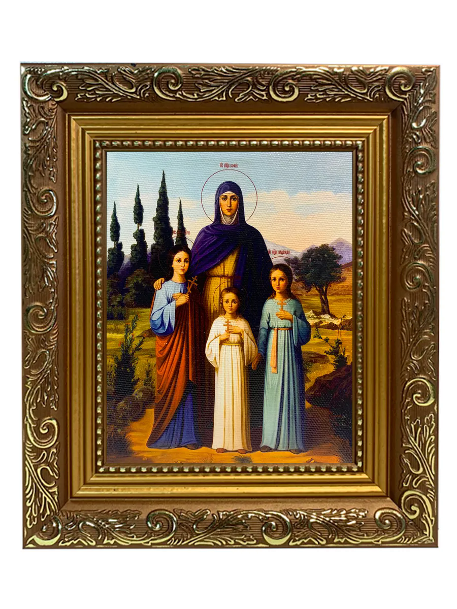Именная икона Вера Надежда Любовь и София Римские с кипарисами на холсте в киоте 044