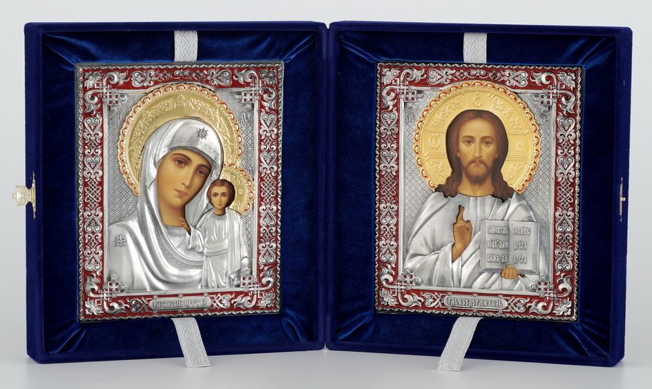 Складни живописные в футляре 18х24 темпера, ризы №241, №242 черненое серебрение, эмаль (бархат)