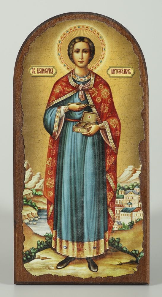 Икона на дереве 11х22 арочная, канвас, упаковка Пантелеимон