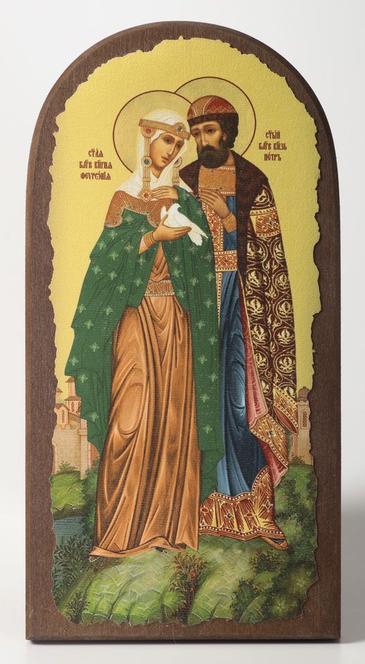 Икона на дереве 11х22 арочная, канвас, упаковка Петр и Феврония