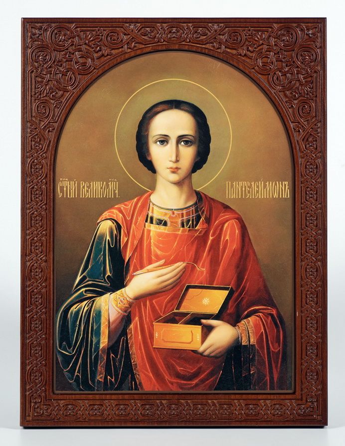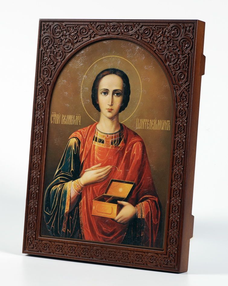 Икона на дереве 25х35 изображение арочное, ковчег с резным обрамлением, упаковка Пантелеимон