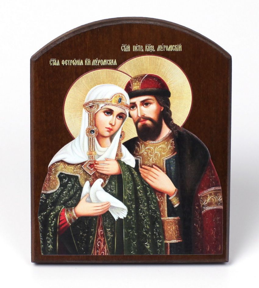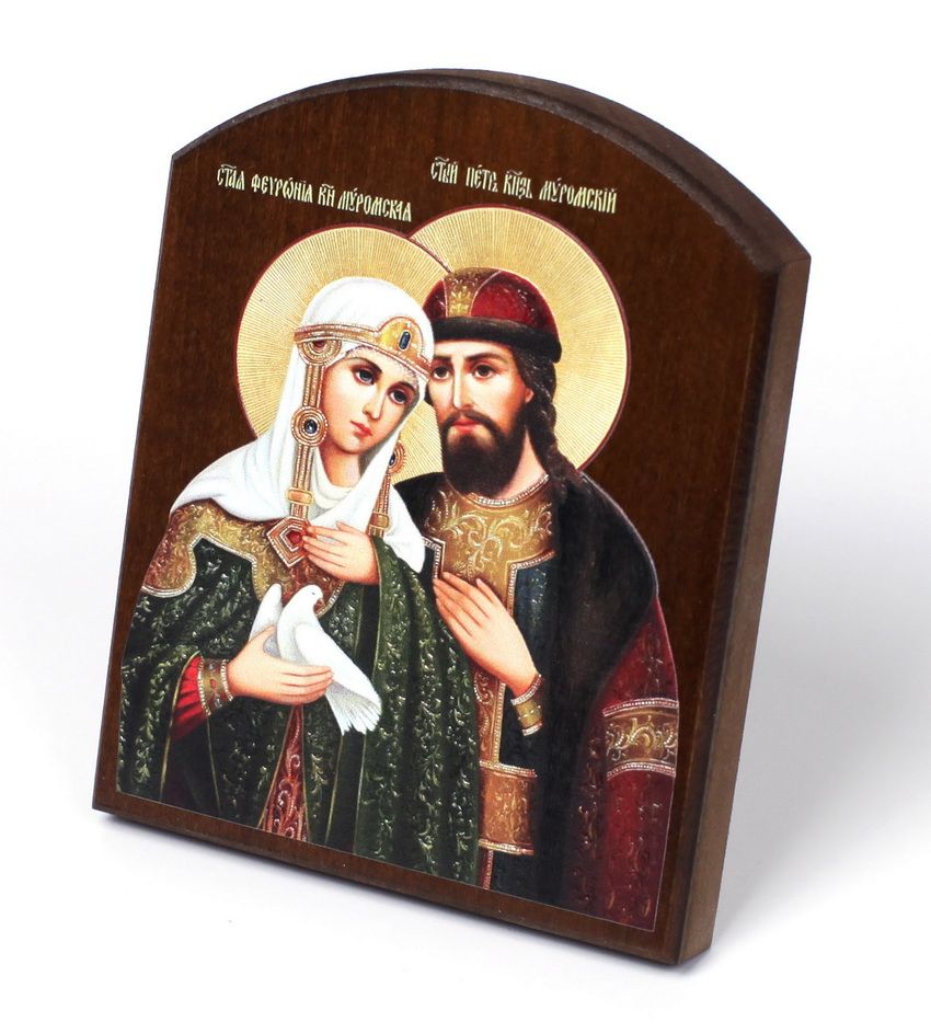 Икона на доске 10х12 объёмная печать, арочная, лак Петр и Феврония