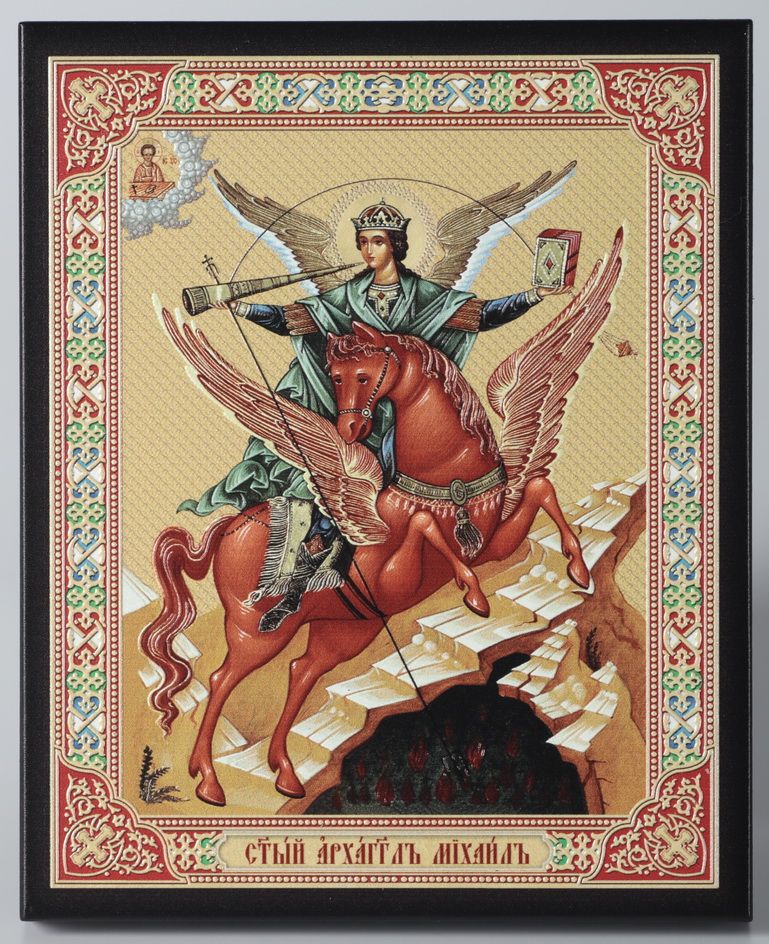 Икона на доске 13х15 объёмная печать, лак Архангел Михаил на коне