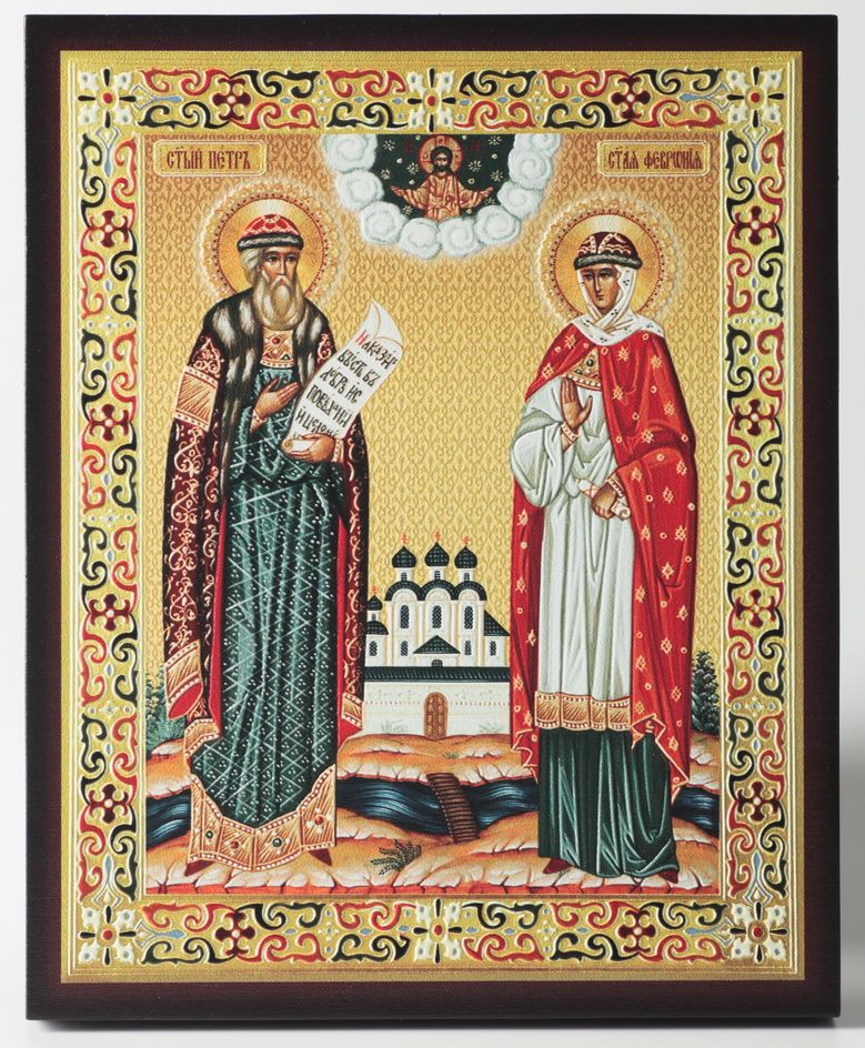 Икона на доске 13х15 объёмная печать, лак Петр и Феврония 2