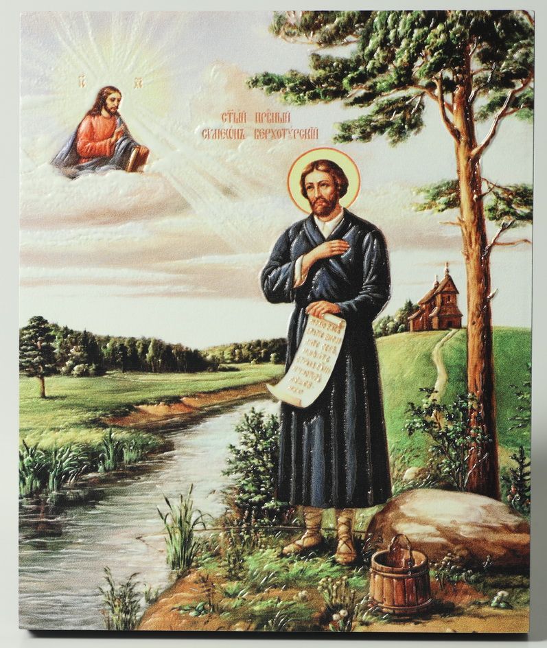Икона на доске 22х26 объёмная печать, лак Симеон Верхотурский на берегу