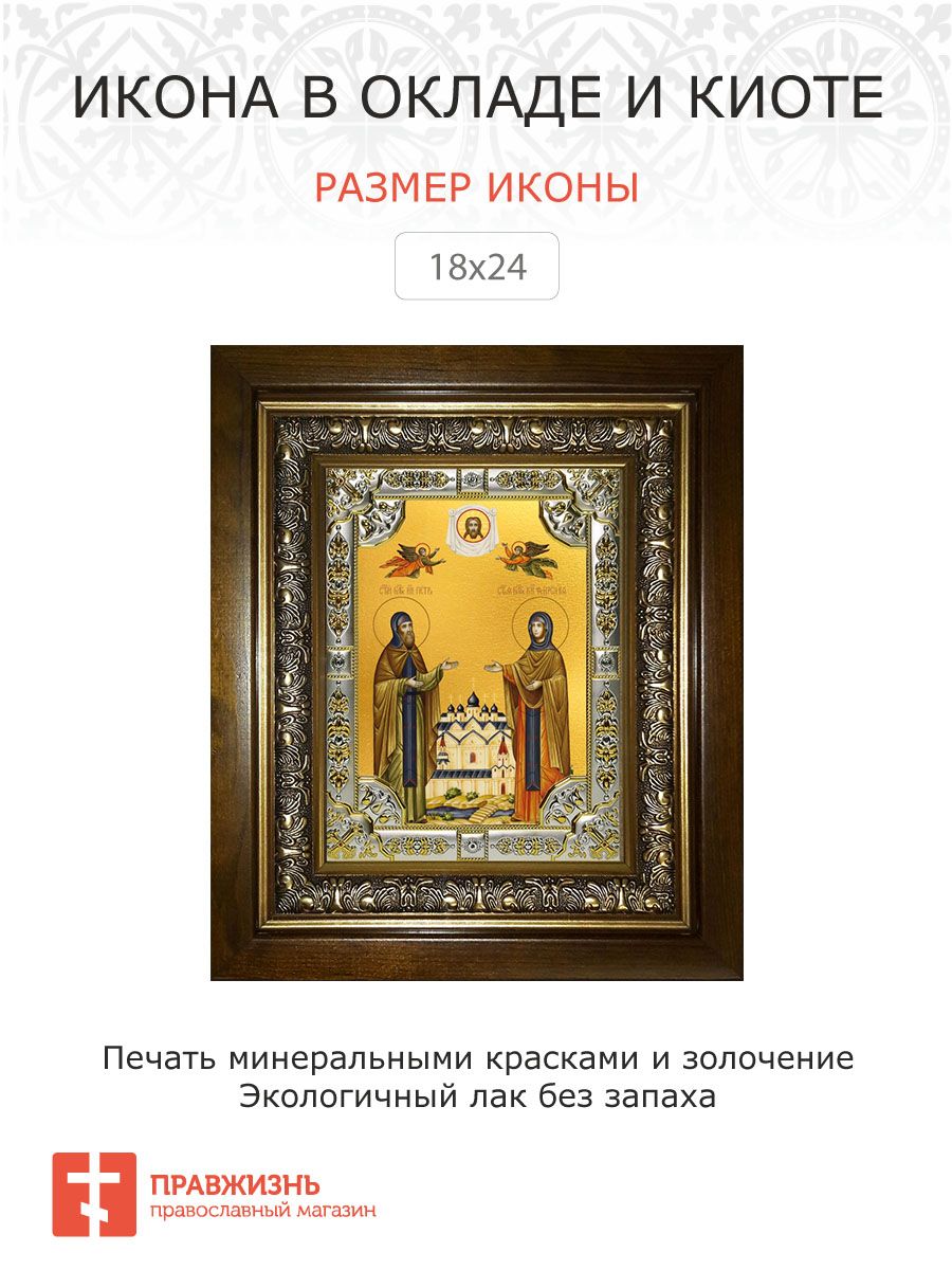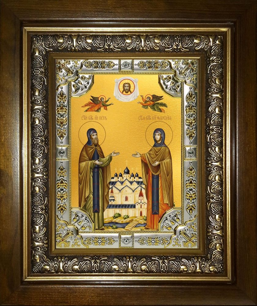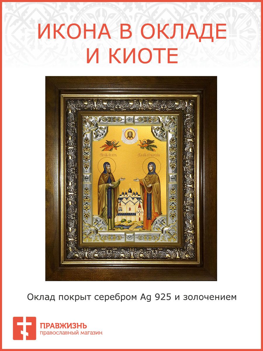 Икона Петр и Феврония святые благоверные князья в деревянном киоте