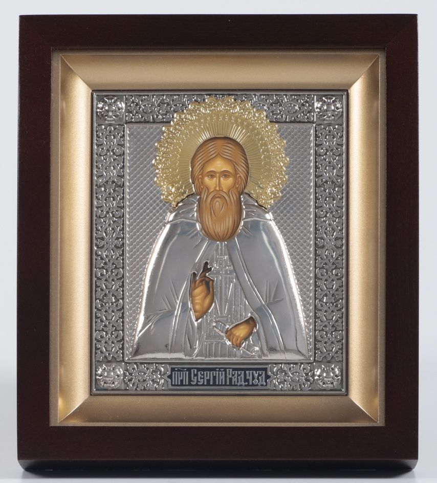 Икона в киоте 11х13 фигурный №2 темпера, пластмассовый подрамник, риза никель, эмаль, золоч Сергий Радонежский
