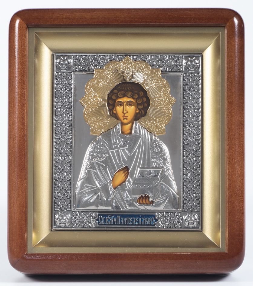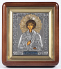 Икона в киоте 11х13 фигурный, темпера, риза, никель, эмаль Пантелеимон