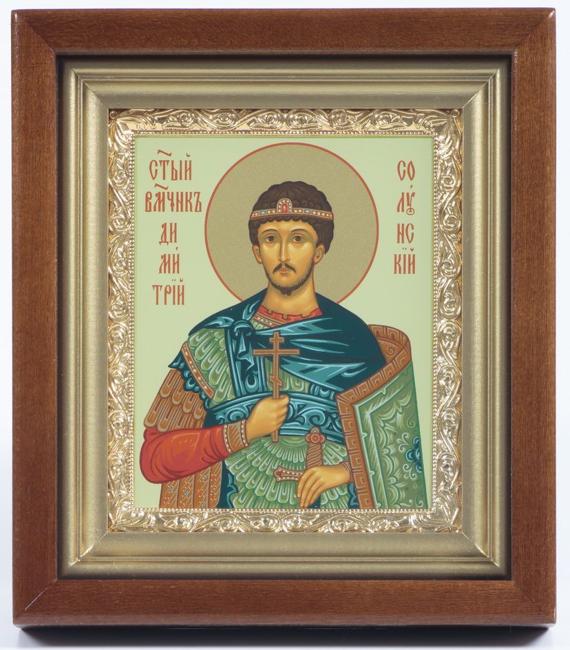 Икона в киоте 11х13 сложный, темпера, рамка золочёная Димитрий Солунский