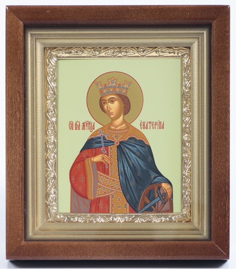 Икона в киоте 11х13 сложный, темпера, рамка золочёная Екатерина