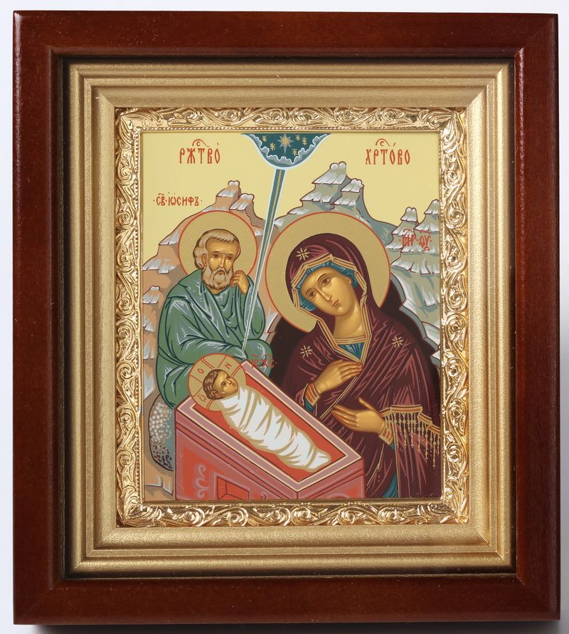 Икона в киоте 11х13 сложный, темпера, рамка золочёная Рождество Христово 1