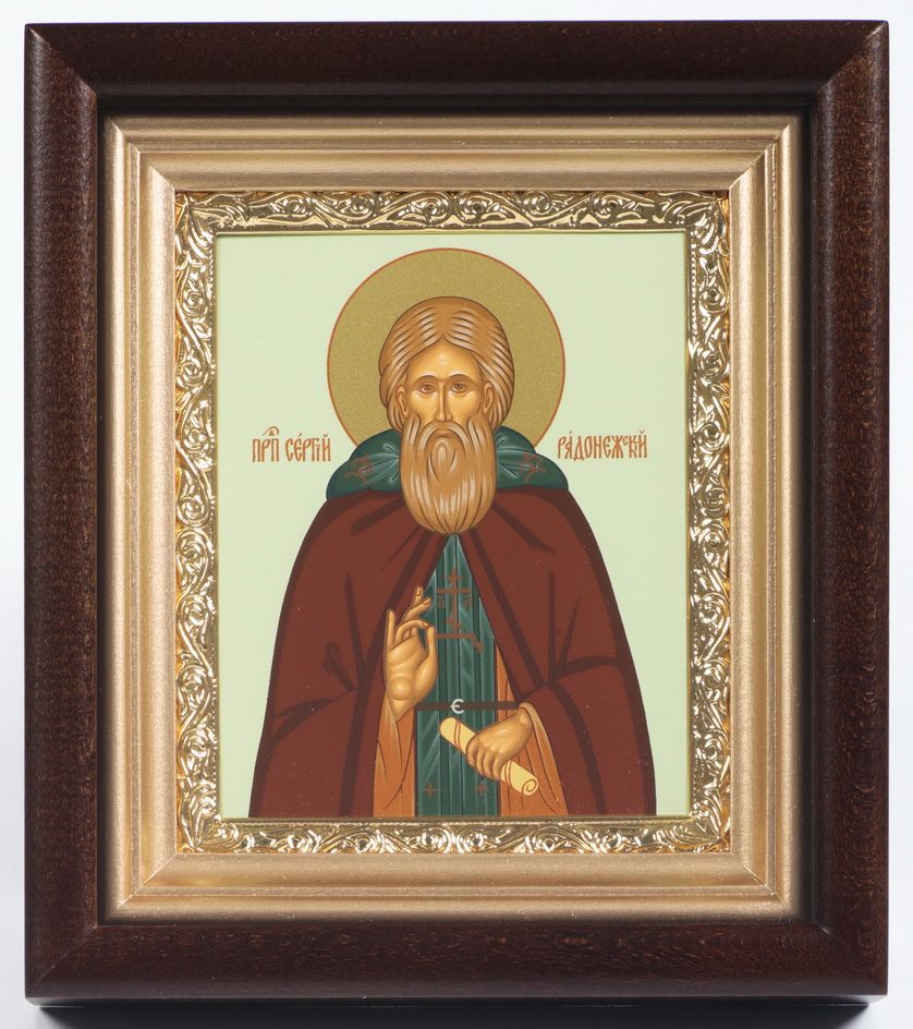 Икона в киоте 11х13 сложный, темпера, рамка золочёная Сергий Радонежский