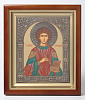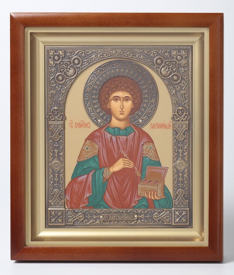 Икона в киоте 15х19 сложный, темпера, венчик, рамка фигурная, патинированая Пантелеимон (золотой фон)