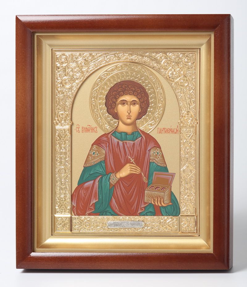 Икона в киоте 15х19 сложный, темпера, венчик, рамка фигурная, золочёная Пантелеимон (золотой фон)