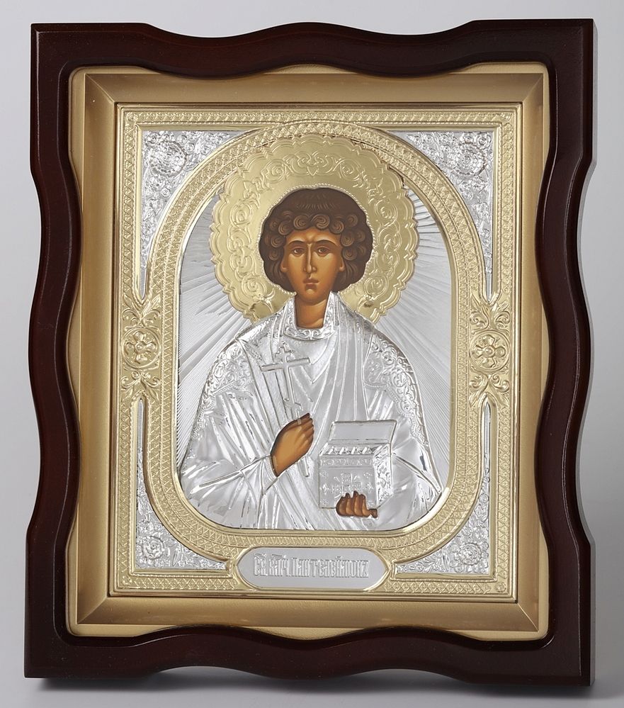 Икона в киоте 18х24 фигурный №4 темпера, риза объёмная №1 Пантелеимон