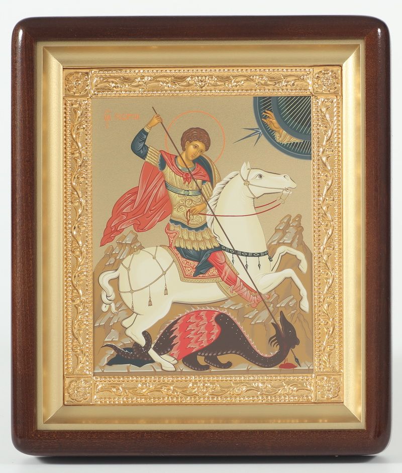 Икона в киоте 18х24 фигурный, темпера №8, рамка золочёная Чудо Георгия о змие
