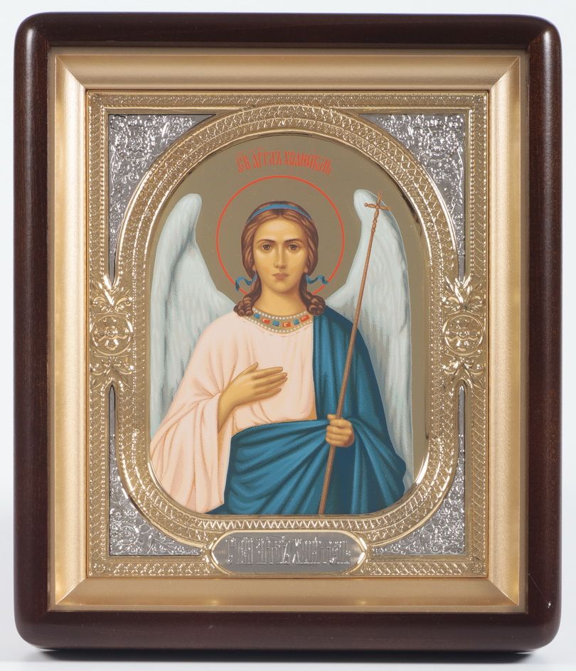 Икона в киоте 18х24 фигурный, темпера №8, риза-рамка объемная, открытая, золочёная, никелирование Ангел Хранитель 1