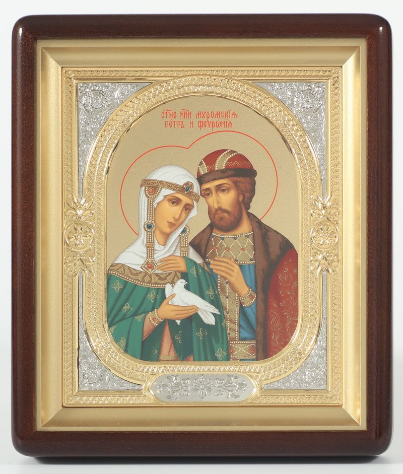 Икона в киоте 18х24 фигурный, темпера №8, риза-рамка объемная, открытая, золочёная, никелирование Петр и Феврония 1