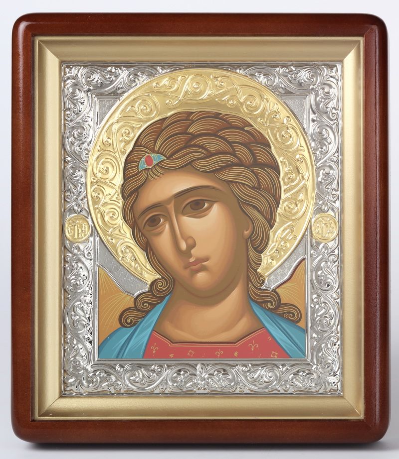 Икона в киоте 18х24 фигурный, темпера, риза никель, золочёный венчик Ангел-Златые власа