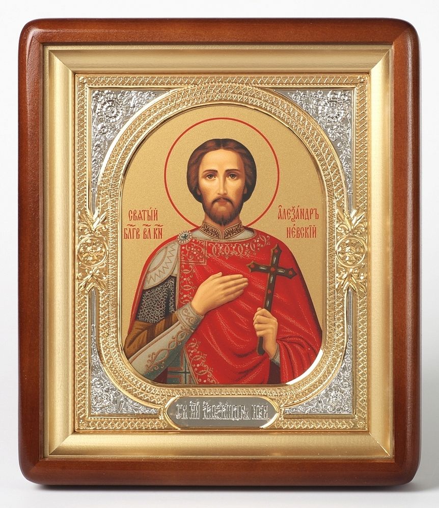 Икона в киоте 18х24 фигурный, темпера, риза-рамка объемная, открытая, золочёная, никелирование Александр Невский 1