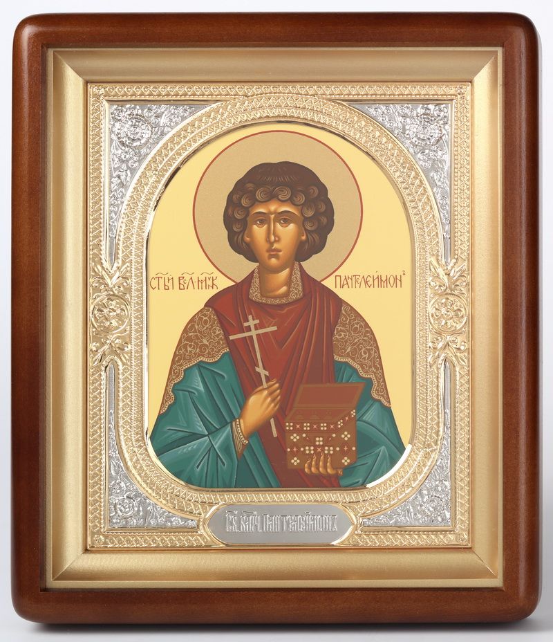 Икона в киоте 18х24 фигурный, темпера, риза-рамка объемная, открытая, золочёная, никелирование Пантелеимон