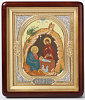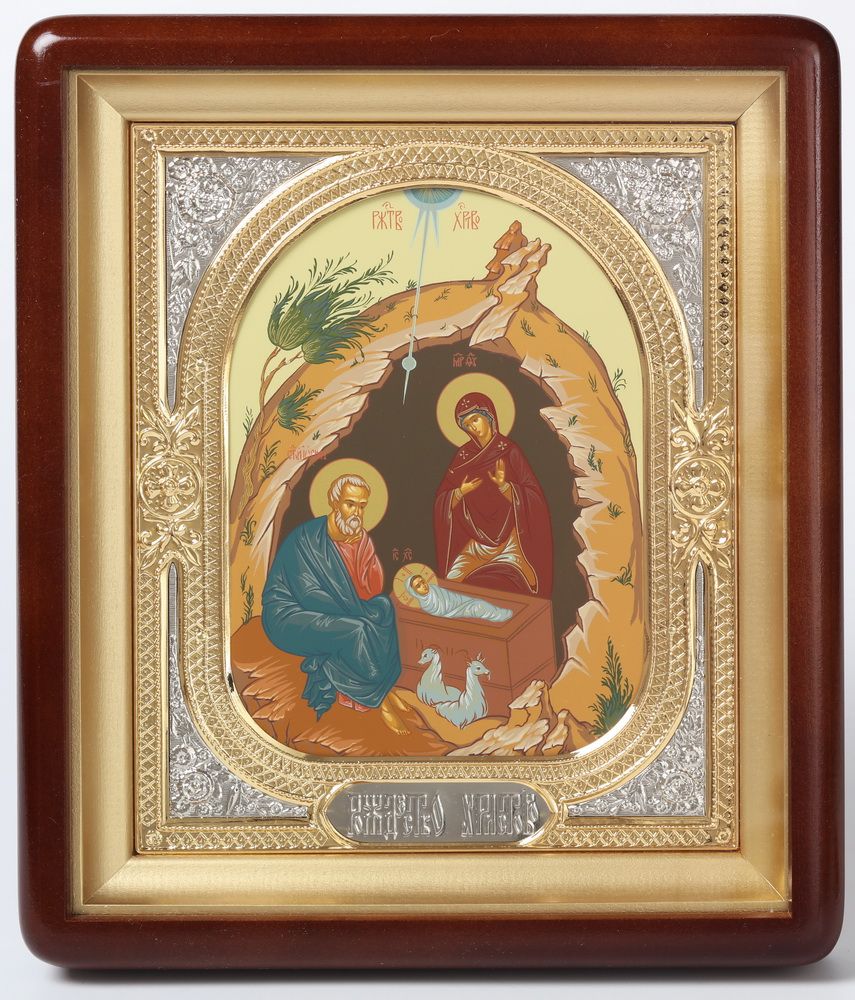 Икона в киоте 18х24 фигурный, темпера, риза-рамка объемная, открытая, золочёная, никелирование Рождество Христово 2