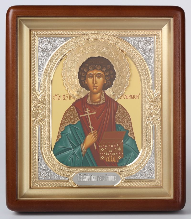 Икона в киоте 18х24 фигурный, темпера, венчик, риза-рамка объемная, открытая, золочение Пантелеимон