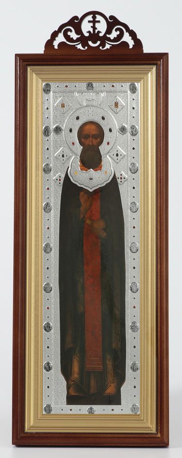 Икона в киоте 20х50 сложный с резным навершием, конгрев Сергий Радонежский 2