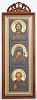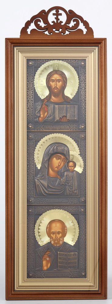 Икона в киоте 20х50 сложный с резным навершием, темпера, риза патинированая Спаситель-Казанская БМ-Н.Чудотворец