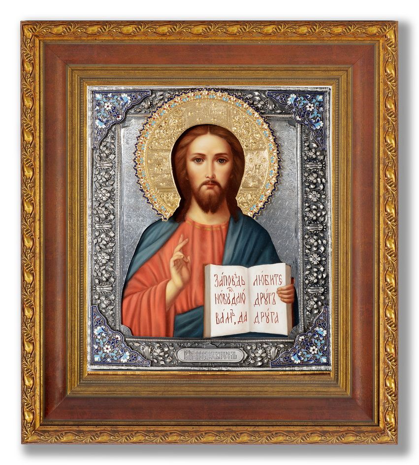 Икона живописная Спасителя 24х30 масло, риза №24, черненое серебрение, эмаль, киот №22