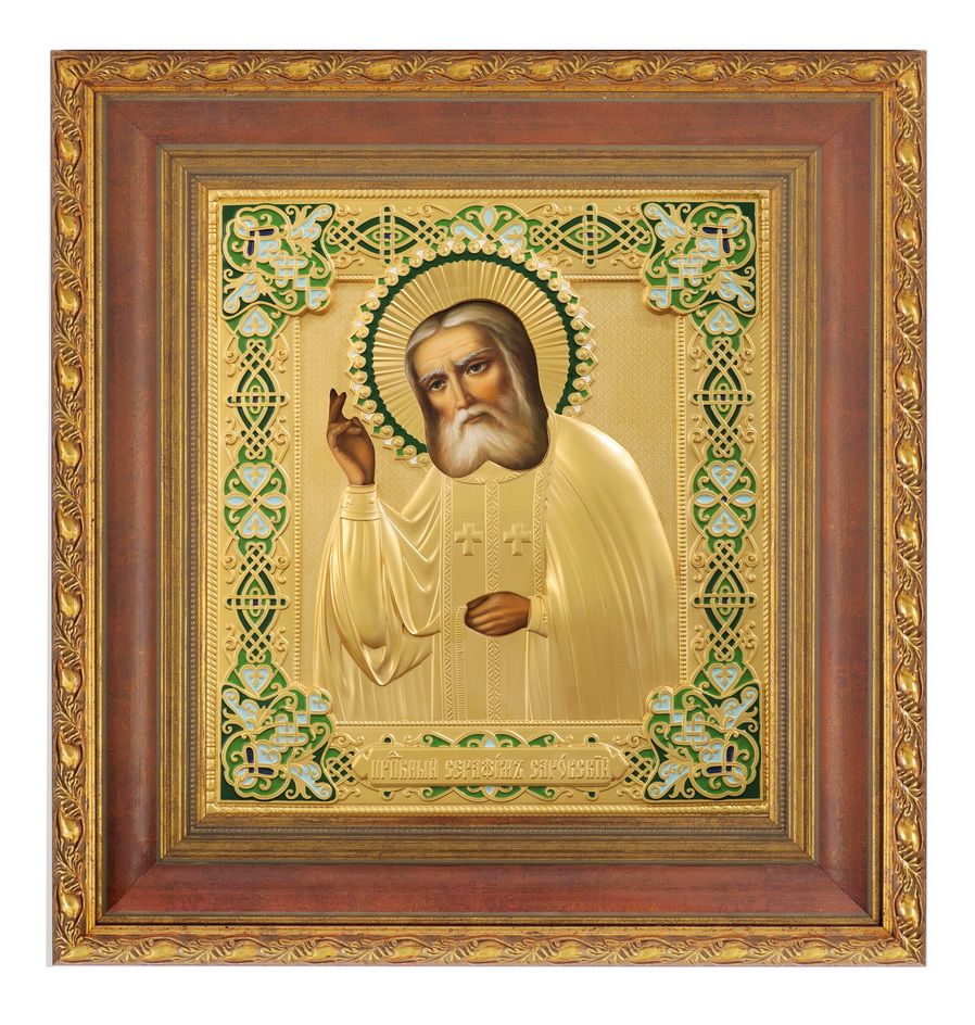 Икона живописная в киоте 24х30 масло, риза №268, матовое полное золочение, эмаль, киот №22 Серафим Саровский