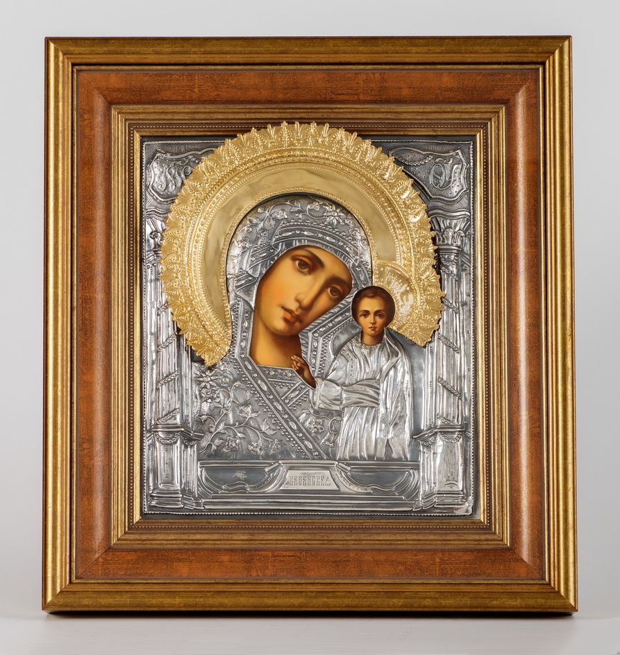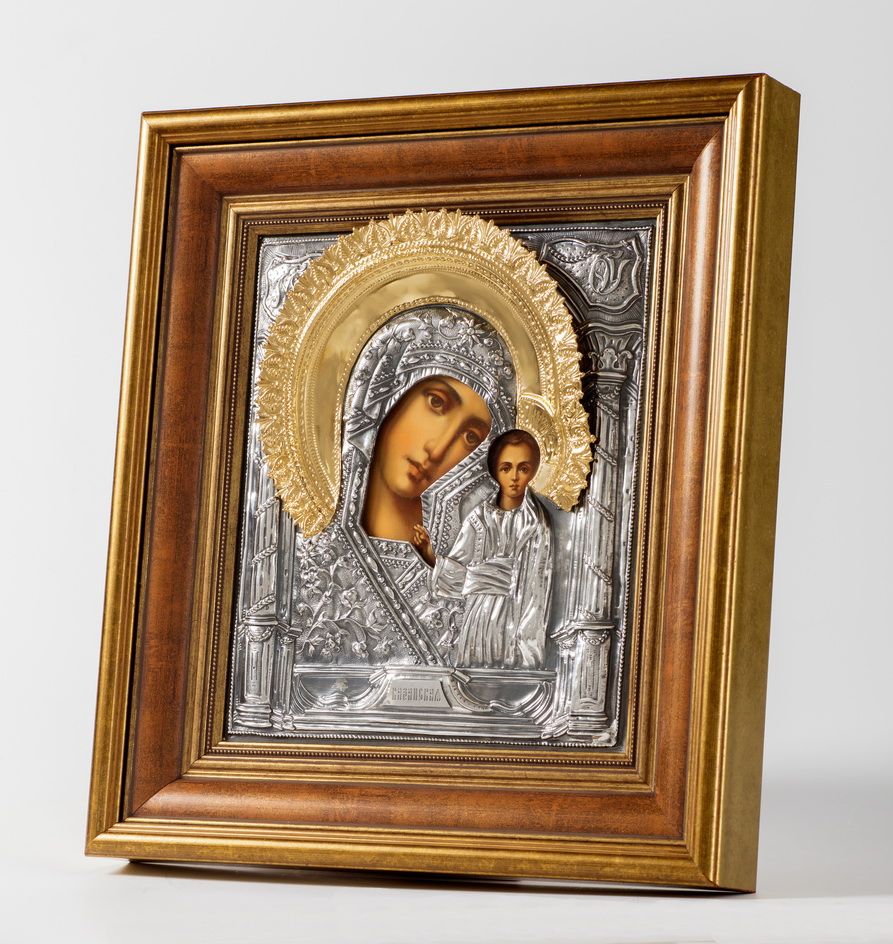 Икона живописная в киоте 24х30 масло, риза №293, черненое серебрение, киот №22 Казанская БМ