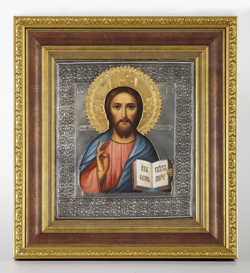 Икона живописная в киоте 24х30 масло, риза №36, черненое серебрение, киот №22 Спаситель