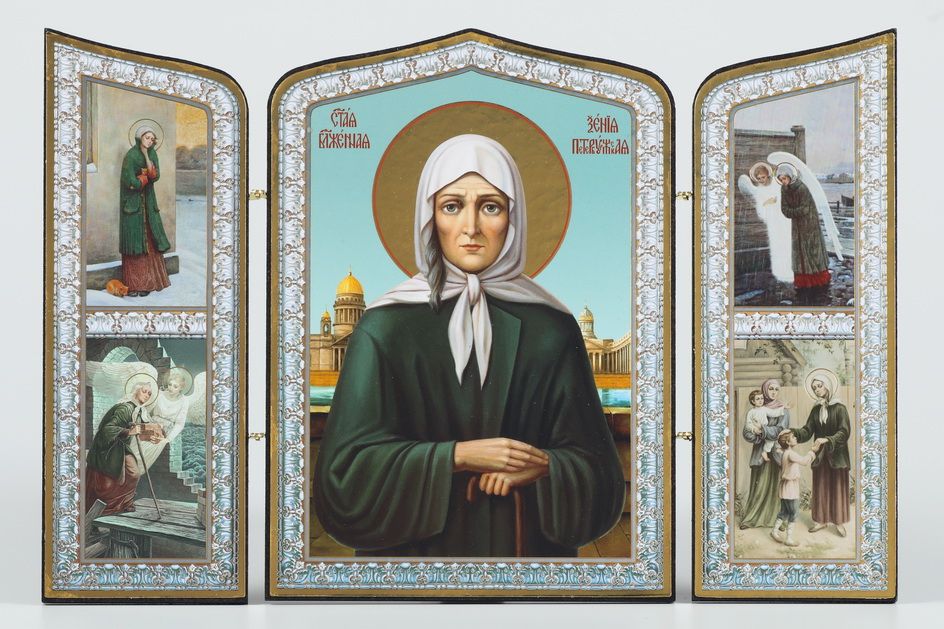 Складни деревянные 19х28 трёхстворчатые, двойное тиснение, фигурные, в упаковке Ксения Петербургская блж.