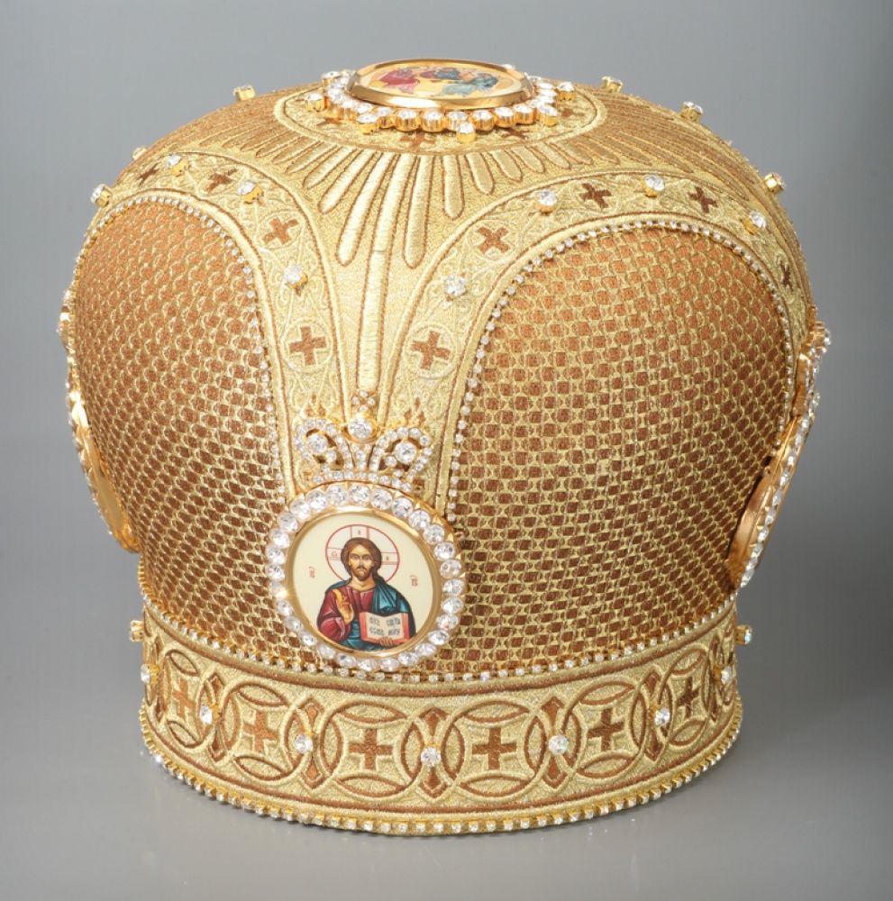 Митра №082 глазет вышивка а/м 5 юв.икон, стр.дорожки, стразы в футляре