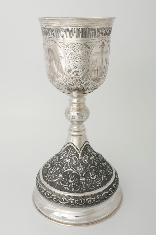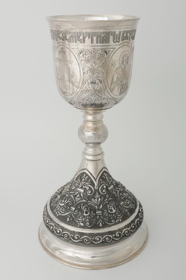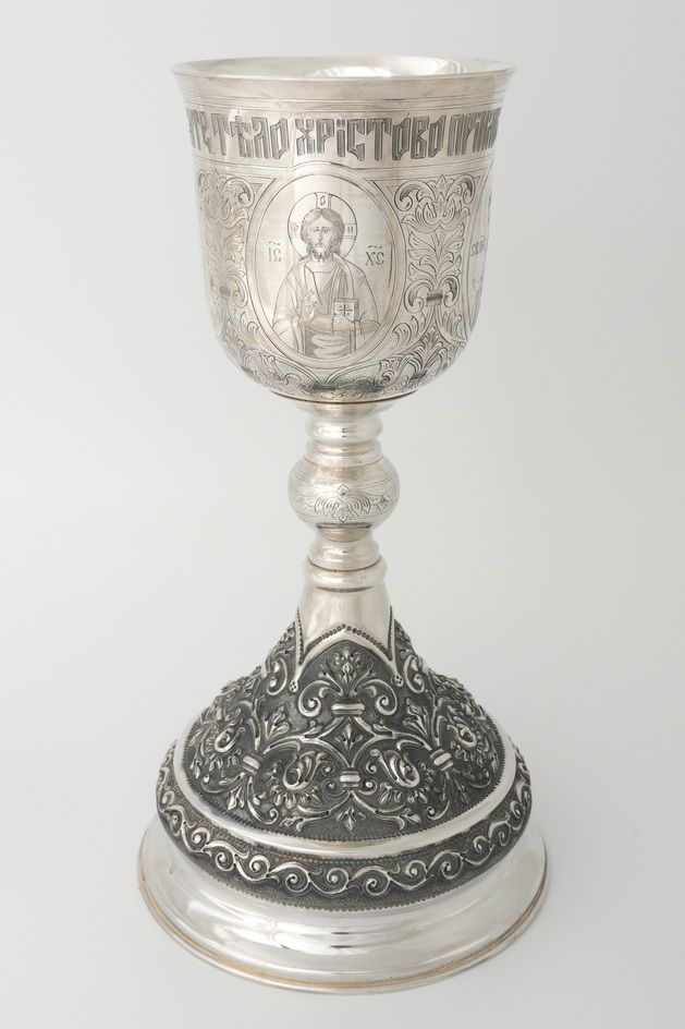 Потир 0.75л ручная гравировка с 4мя-ликами, чеканка / поддон 1, 5л потира / серебро (УИН)