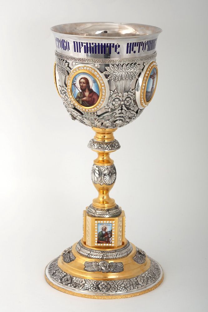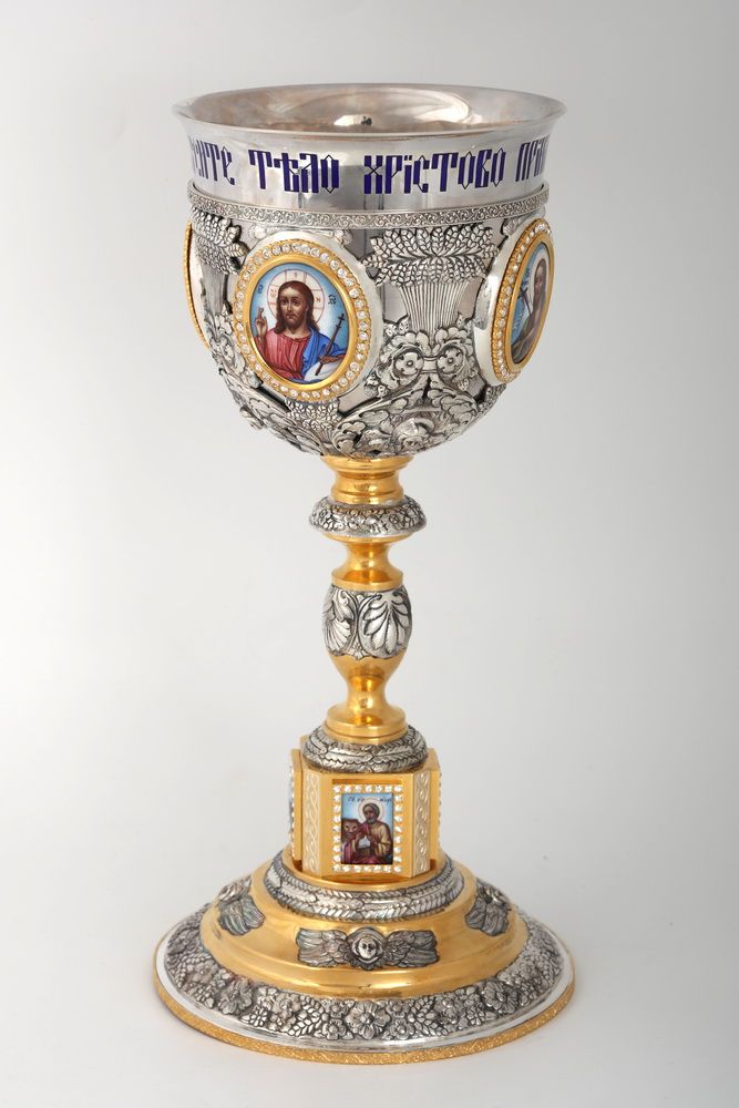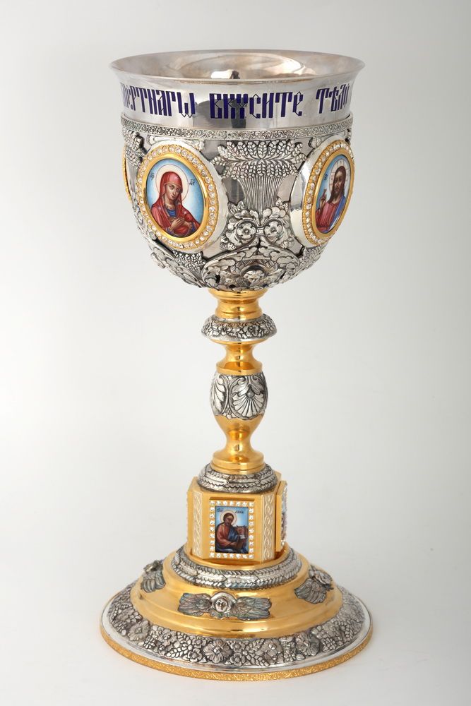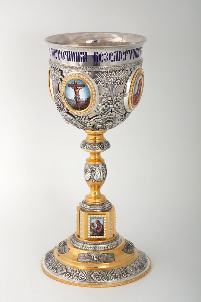 Потир 1.5л 8-финифтей, чеканка, эмаль припильная / квадратная финифть на поддоне / золочение / серебро (УИН)