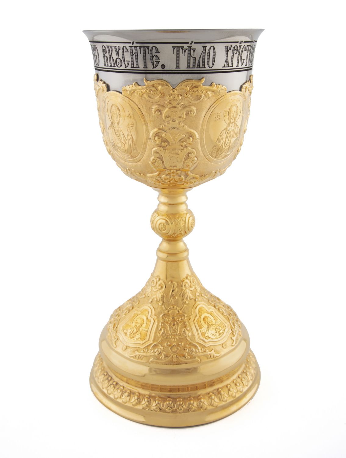 Потир 1.5л 8-гравированных ликов, чеканка / золочение / нержавеющий стакан