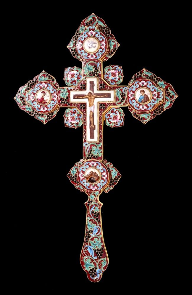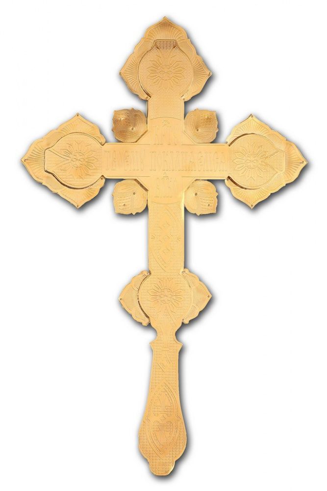 Крест напрестольный №4 5-финифтей, филигрань, эмаль, роспись, хим.гравировка / золочение