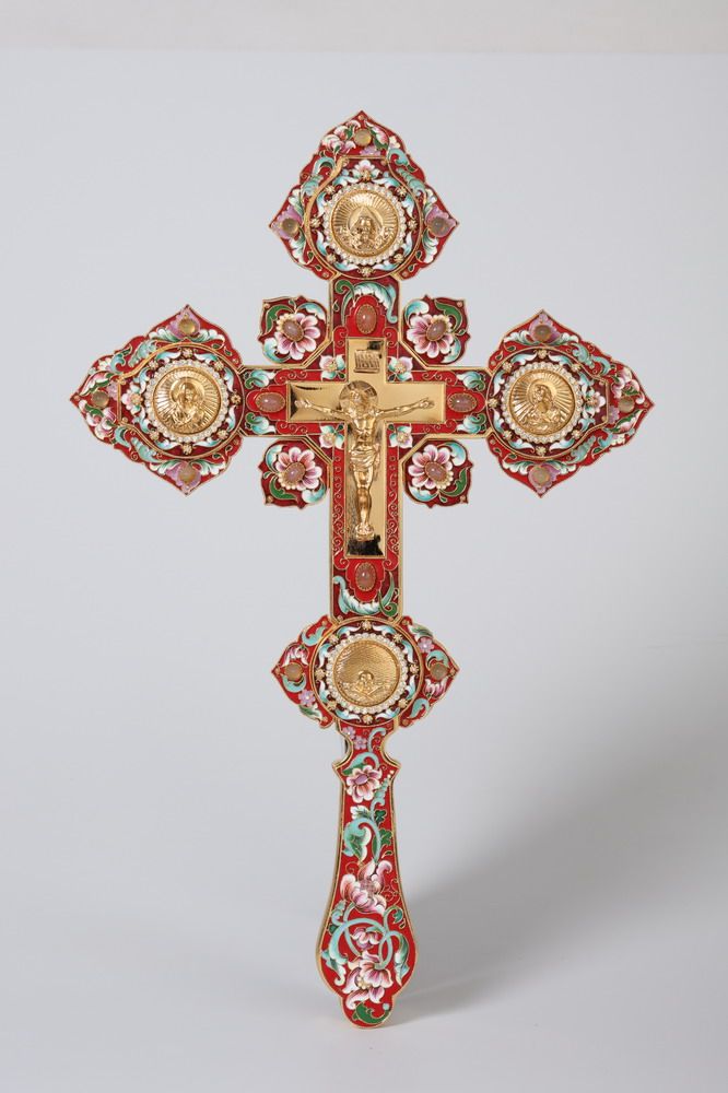 Крест напрестольный №4 распятие, лики, филигрань, эмаль, роспись, хим.гравировка / золочение
