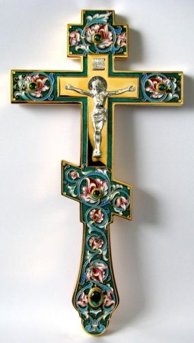 Крест напрестольный филигрань, эмаль, роспись, литьевое распятие / золочение
