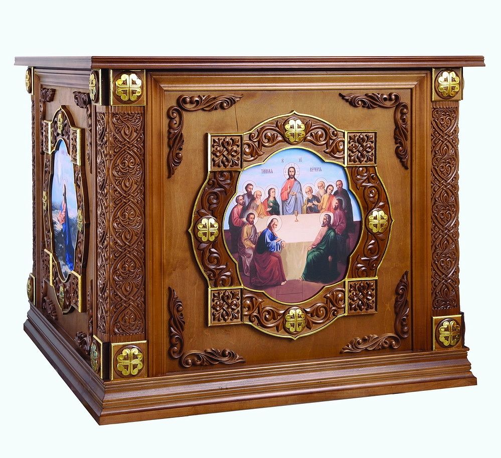 Резьба, морение, лак, иконы-фотопечать,частичное золочение-сусальное золото.