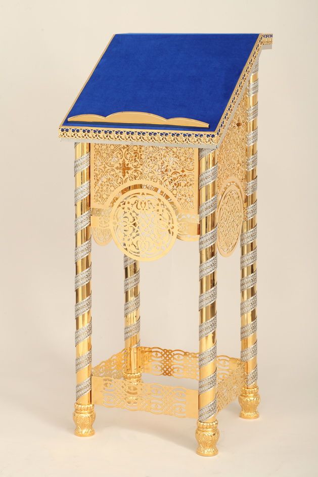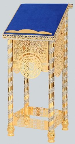 Подставка под икону №7 с золочением является стационарный и представляет собой массивную тумбу. Такая подставка носит название проскинитарий. Он устанавливается в центре храма либо в стороне от его главной оси. Предназначен проскинитарий для постоянного размещения аналойной иконы, к которой могут припадать прихожане.