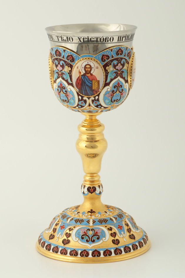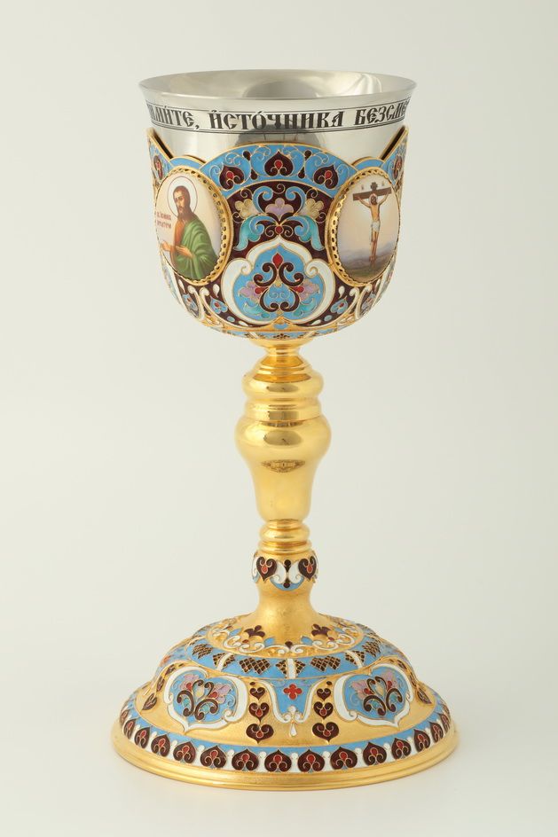 Потир 1.0л 4-деколи, филигрань, эмаль "№1" / золочение / мельхиоровый стакан