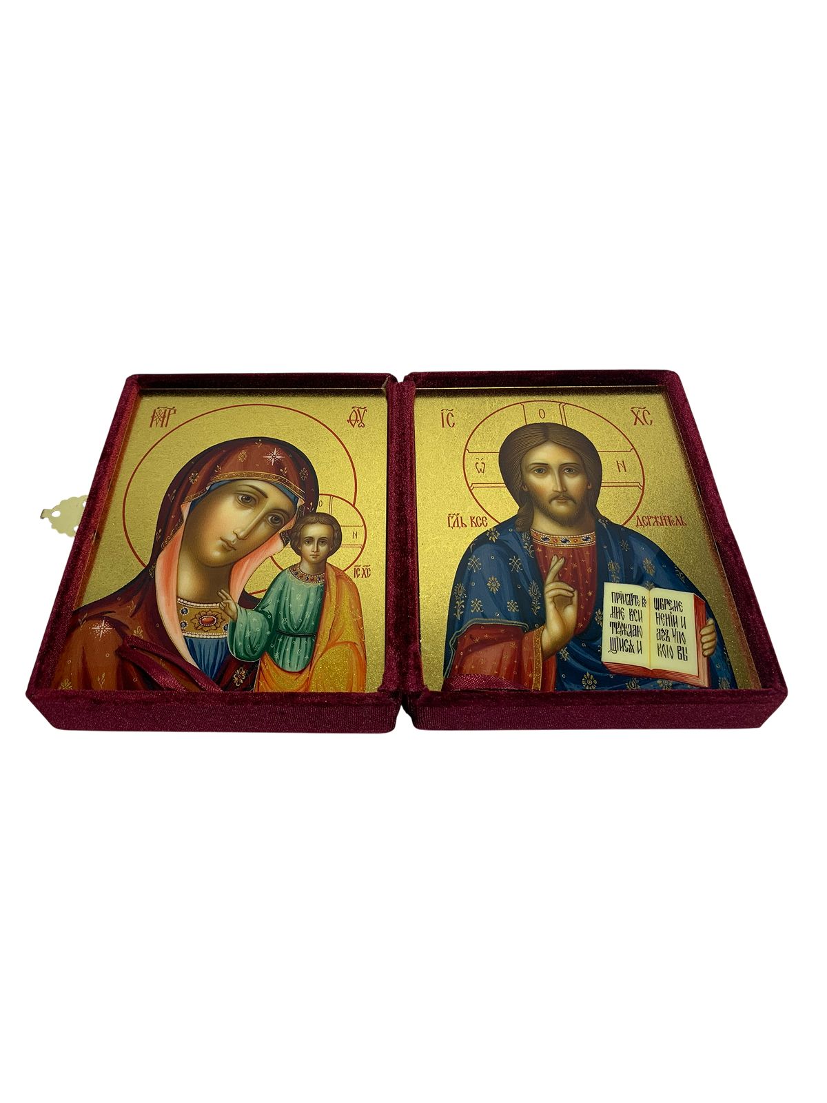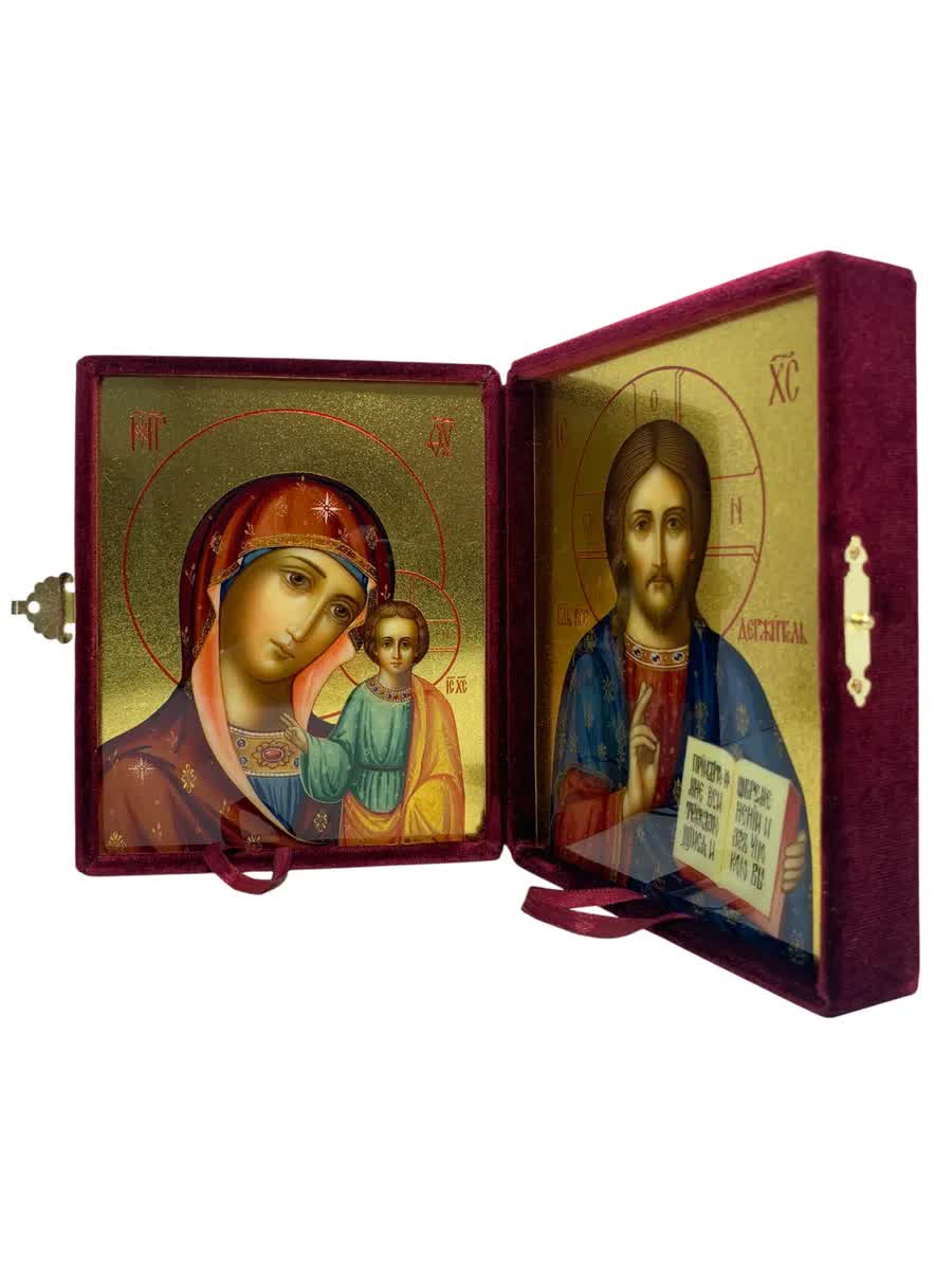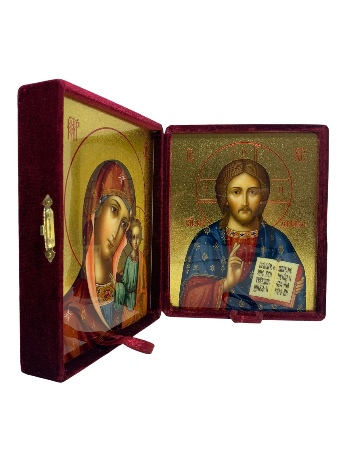 Венчальные иконы Спаситель и Казанская с золочением УЛ 13х16 в бархатном складне