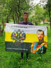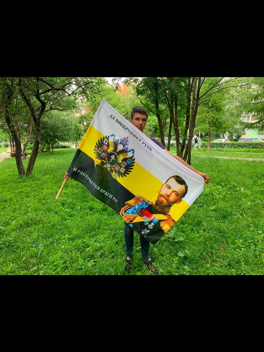На флаге размещён портрет Николая II — последнего императора России, олицетворяющий царскую власть, историческую преемственность и преданность традициям. Государственный герб с двуглавым орлом подчеркивает суверенитет, силу и единство Российской империи.